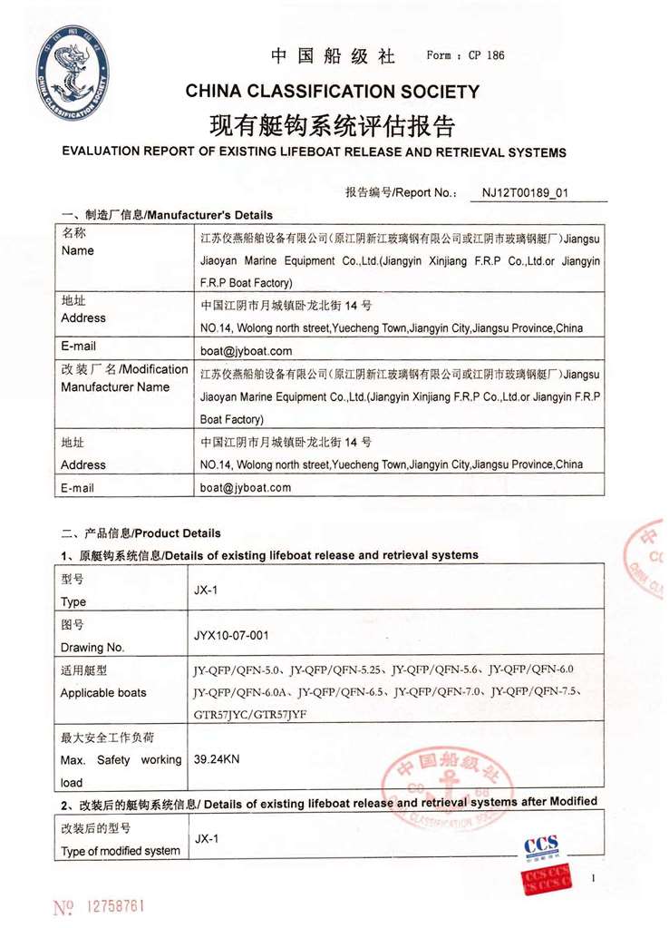 附录1:CCS船级社对现有艇钩系统的评估报告 示例1
