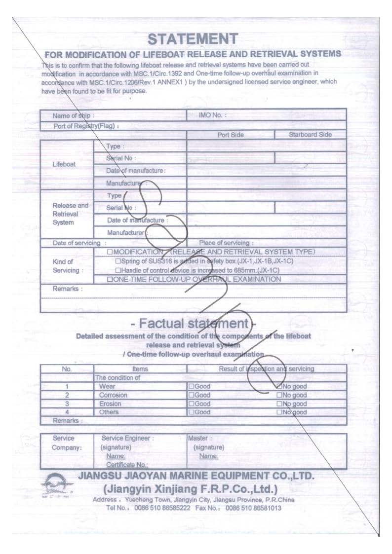 近期,发现国内存在一些服务公司为牟取私利,置船员生命安全于不顾,未经我公司专业培训和认可,擅自对我公司(半岛注册/江阴新江玻璃钢有限公司)生产的救生艇设备进行救生艇吊钩改造,同时签发伪造的声明,因此引起了重大的安全事故.重要提示:半岛注册(江阴新江玻璃钢有限公司)对一切未经本公司专业培训和认可的服务商提供的对本公司产品的所有服务不承担任何责任,并保留对其追究法律责任的权利.